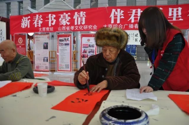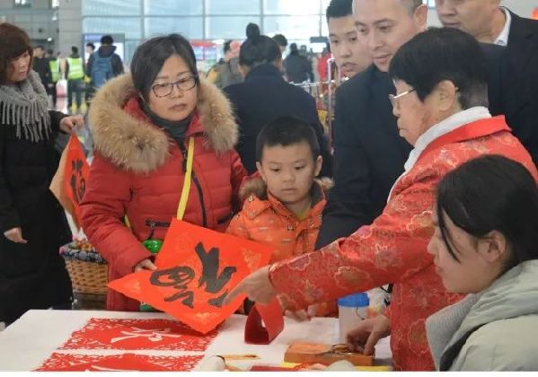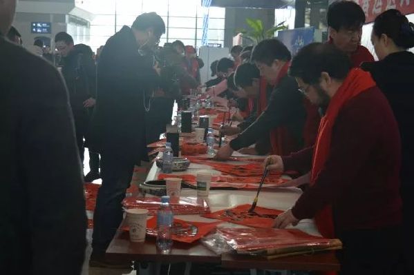 2018年2月9日到15日 “新春书豪情,伴君万里行” 书画名家免费送福送春联活动在太原南站举办,由太原南站、山西省孝文化研究会、太原综合广播春运联袂送祝福,在南站候车大厅,由传统文化专家、书法家和楹联专家共同挥毫书写了一幅幅写满幸福和希望的春联、福字,免费赠送到旅客手中。