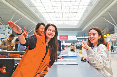 春节长假返程高峰到来之际,几名外籍志愿者在郑州高铁东站为旅客提供咨询、引导服务。据了解,今年中国铁路郑州局集团公司招募15名外籍志愿者,服务春运、助力旅客出行。马跃峰 霍亚平摄影报道