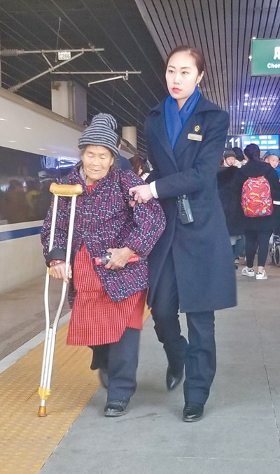 春运返程高峰期,成都站、成都东站铁路工作人员爱心接力,携手帮助一名行动不便且误了车的老人改签、乘车。图为成都东站的工作人员送老人上车。付 豪摄(人民视觉)