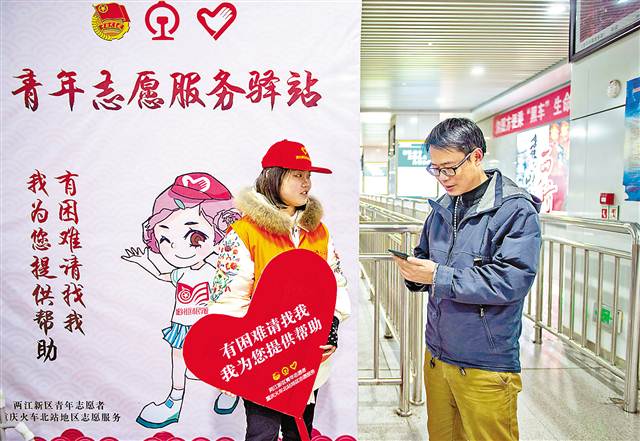 2月15日,杜逍颖在重庆北站北广场的志愿者岗位上坚守,服务旅客。 记者 齐岚森 摄