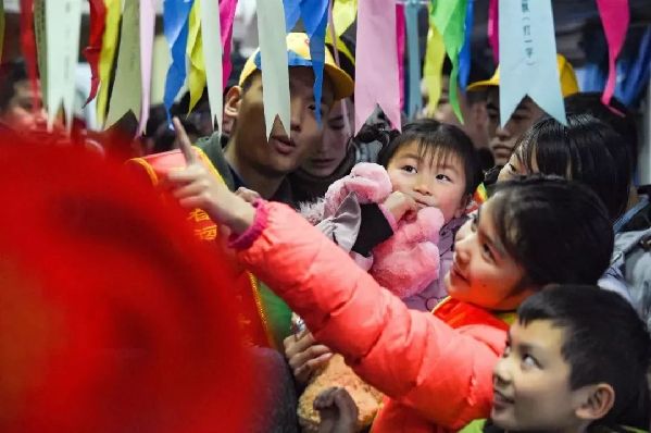 2月19日,大年初四,志愿者们在列车上举行了猜灯谜活动,并为车上儿童送上吉祥公仔,为节日期间乘坐列车的旅客带来了知识与欢乐。