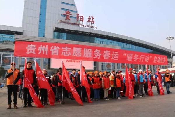 贵州省2018年志愿服务春运“暖冬行动”在贵阳拉开序幕。志愿者们每天走进售票厅、候车室,为出行、返乡旅客送去了志愿者现场书写的春联、温暖包、开水、姜茶等,还通过相声、双簧等老百姓喜闻乐见的表演为出行、返乡旅客宣讲党的十九大精神,普及平安出行、扶贫政策等知识,为他们送去温暖的祝福。