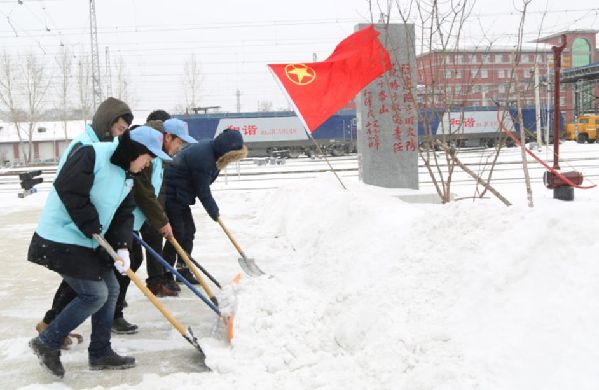 哈尔滨机务段11名“小蓝鸽”主动出击,清理职场积雪。