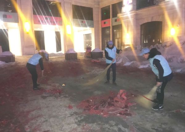 哈尔滨南站的“小蓝鸽”倡导绿色春节,清理街道残留的烟花爆竹碎屑。
