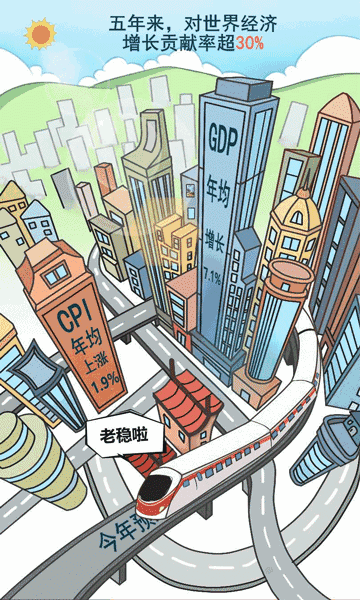五年来,经济实力跃上新台阶。国内生产总值从54万亿元增加到82.7万亿元,年均增长7.1%,占世界经济比重从11.4%提高到15%左右,对世界经济增长贡献率超过30%。财政收入从11.7万亿元增加到17.3万亿元。居民消费价格年均上涨1.9%,保持较低水平。