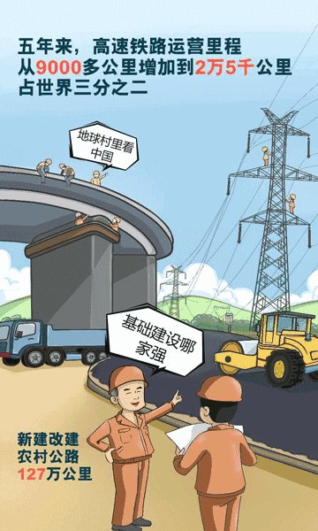 五年来,高速铁路运营里程从9000多公里增加到2万5千公里、占世界三分之二,高速公路里程从9.6万公里增加到13.6万公里,新建改建农村公路127万公里,新建民航机场46个,开工重大水利工程122项,完成新一轮农村电网改造,建成全球最大的移动宽带网。