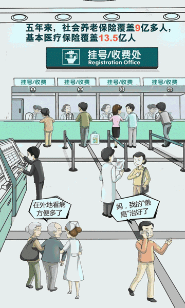 五年来,社会养老保险覆盖9亿多人,基本医疗保险覆盖13.5亿人,织就了世界上最大的社会保障网。人均预期寿命达到76.7岁。