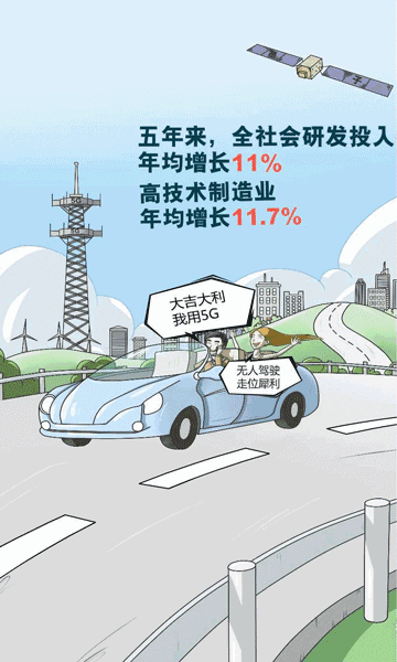 五年来,全社会研发投入年均增长11%,规模跃居世界第二位。科技进步贡献率由52.2%提高到57.5%。载人航天、深海探测、量子通信、大飞机等重大创新成果不断涌现。