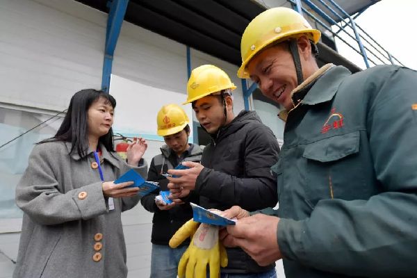 在江西省南昌市青云谱区一个建筑工地上,青云谱区劳动监察局工作人员向农民工们了解工资发放情况。新华社记者彭昭之 摄