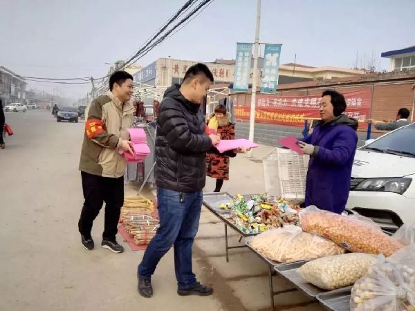 黄堽镇青年志愿者在农村大集的时候向群众发放交通安全常识宣传页。