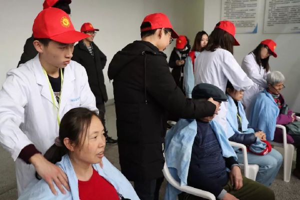 徐州医科大学的大学生志愿者们为居民提供推拿服务