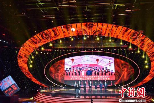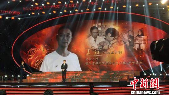 颁奖晚会上,“兰小草”精神志愿者为“最美医生”王珏献奖。洞头宣传部提供