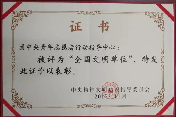 团中央青年志愿者行动指导中心以文明单位创建优化部门环境,促进业务发展,推动部门精神文明建设。2008年曾荣获中共中央、国务院、中央军委授予的“全国抗震救灾英雄集体”,2009年曾荣获国务院授予的“全国民族团结进步模范集体”,2017年荣获“中直机关文明单位标兵”称号。