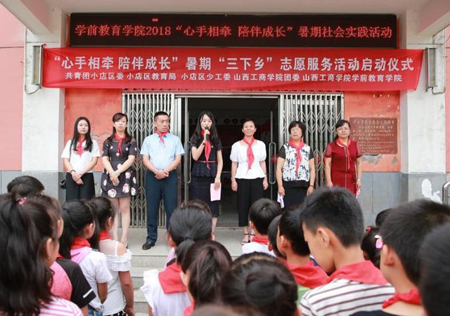 活动现场,来自山西工商学院的青年志愿者们与少先队员们交流互动,了解孩子们的暑期生活情况。
