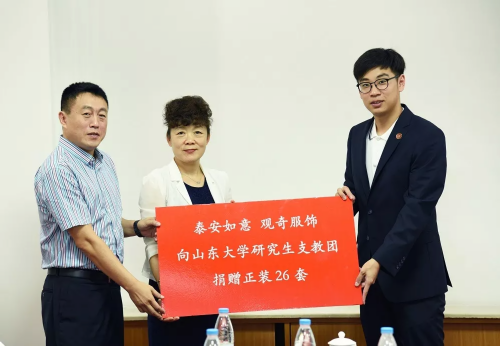 随后,泰安如意集团总经理王文革发表讲话,表达了她对研究生支教团的崇高敬意与美好祝愿。泰安如意科技时尚产业有限公司和观奇洋服为研究生支教团捐赠正装。赞助集团的慷慨相助不仅让支教团成员心生温暖与感动,而且也一定会收获支教地孩子们的感激。团结协助、众志成城,各方力量的大力支持不仅是支教活动顺利进行的最有利保障,同时也是对社会大爱、共同理想的真实体现。