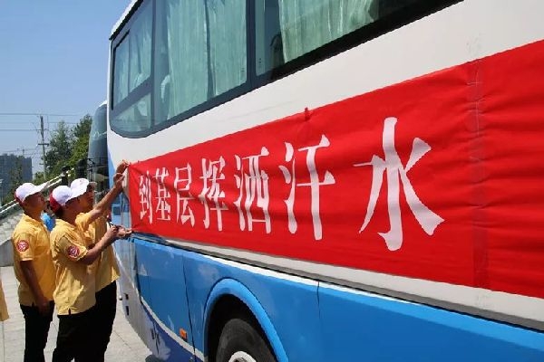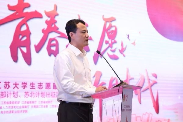 江苏团省委书记王伟为即将出征的大学生志愿者授旗并讲话。江苏省委组织部部务委员黄楚中、省教育厅副厅长苏春海、省人力资源和社会保障厅副厅长朱从明、团省委副书记潘文卿,团中央青年志愿者行动指导中心项目管理处处长杨业功,南京铁道职业技术学院党委书记钱吉奎、院长张颖超等出席。来自全省高校的团委书记、苏北五市项目办代表、青年志愿者等1000余人参加出征活动。