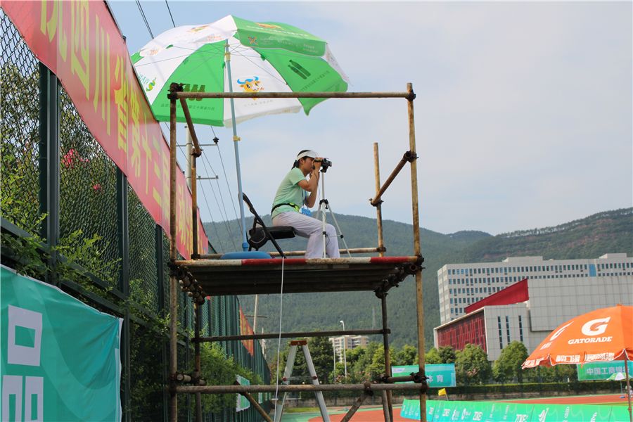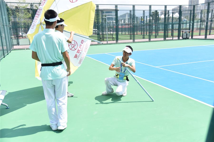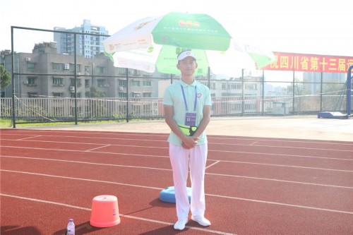 青小元放下手中的工作,奔往教练员和运动员所在的遮阳棚,用手抓紧支架,稳住重心,用尽全力确保遮阳棚不随风晃动,就算头发衣服湿透,这些青小元还是带着可爱的笑脸,不仅充满着青春的味道,也是青小元微笑服务他人精神的完美体现。