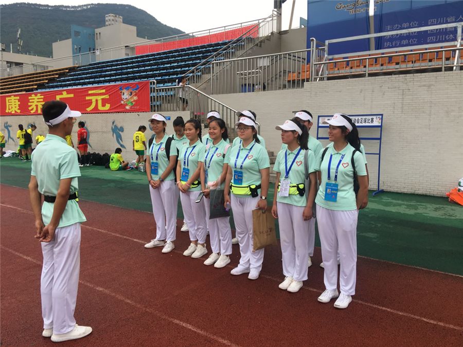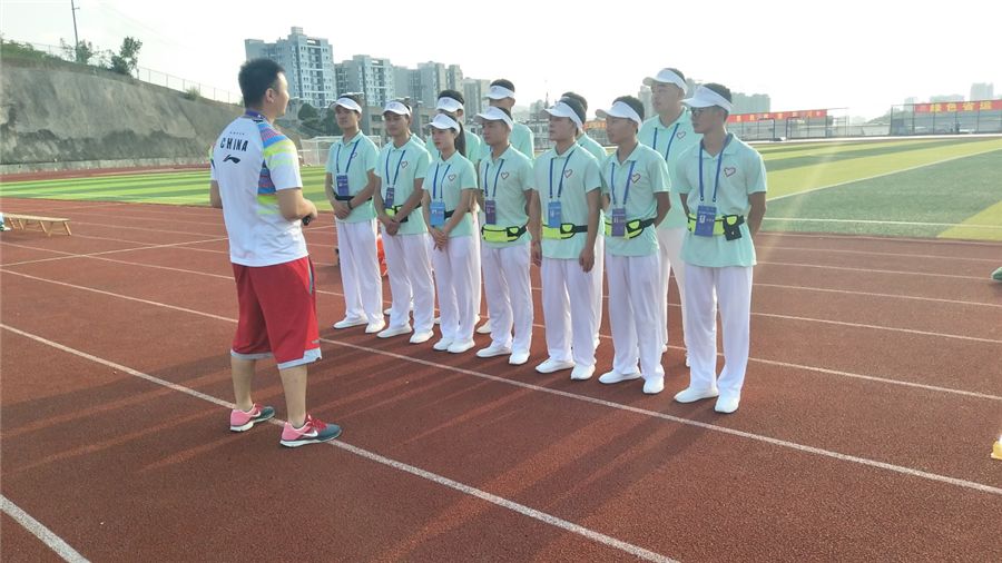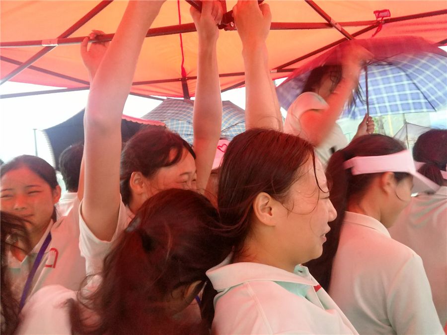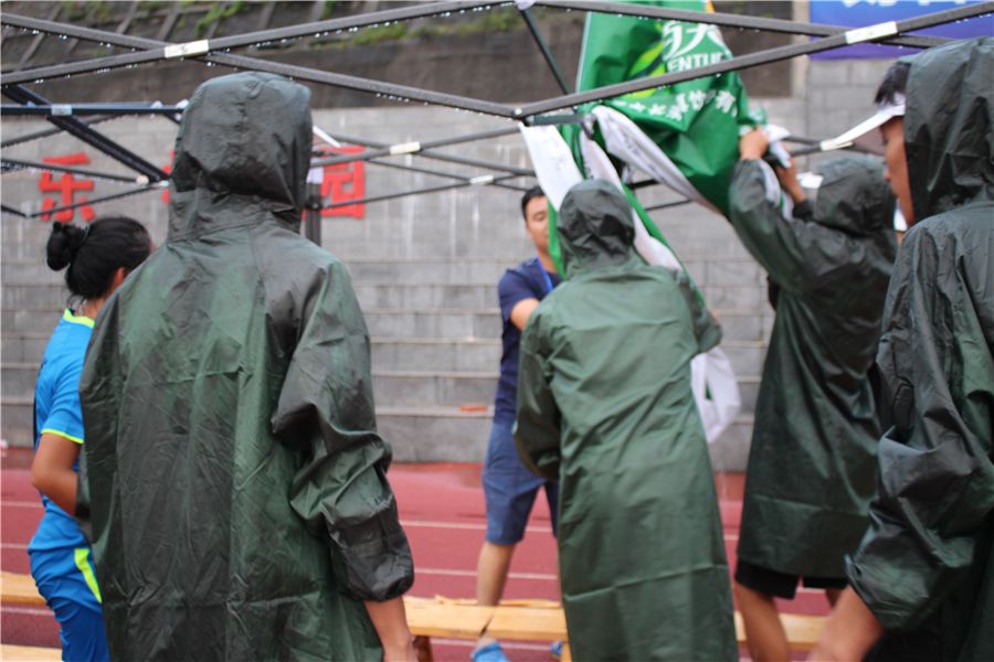 比赛尚未结束,就已狂风大作,电闪雷鸣,突然下起瓢泼大雨。在场带队老师立刻发布指令:“所有志愿者马上行动,撑住遮阳棚,不要让休息的教练和运动员淋雨!”
