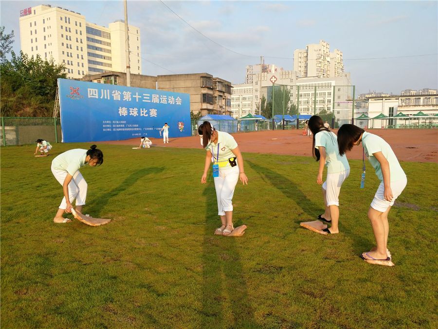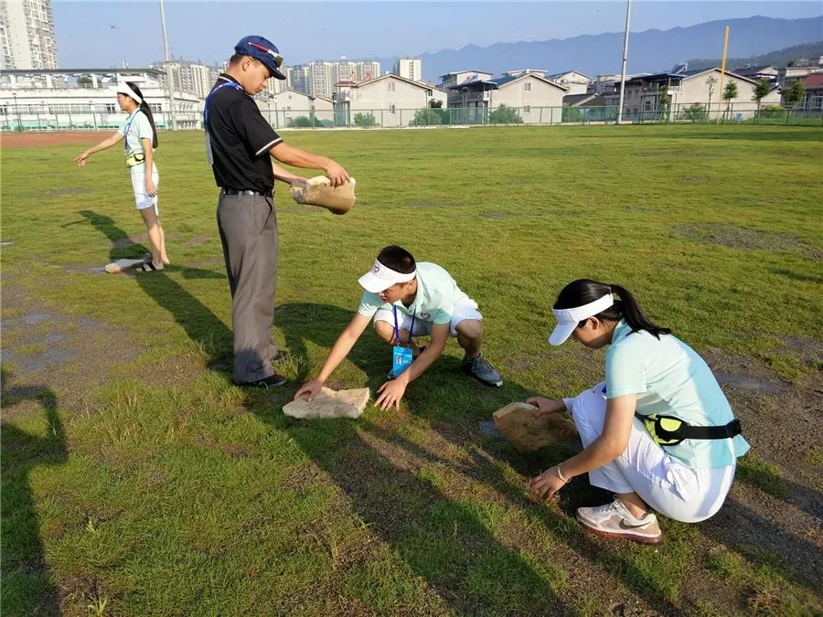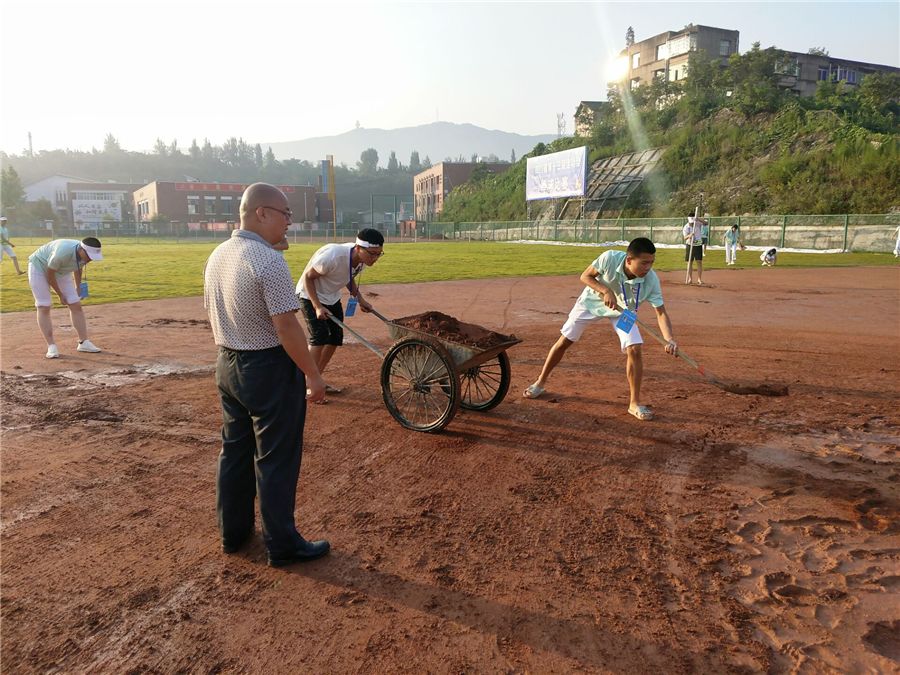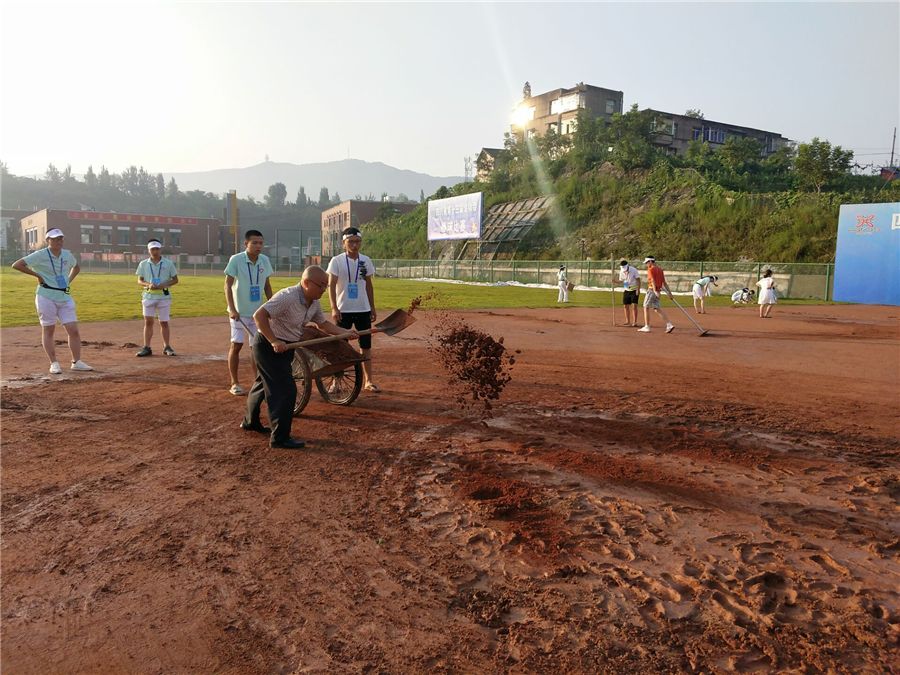 这是棒球赛场的一幕,树人中学的带队老师也加入了青小元的行列,他们一起齐心协力填补被雨水冲刷的比赛场地,为省运会棒球比赛正常运行保驾护航。