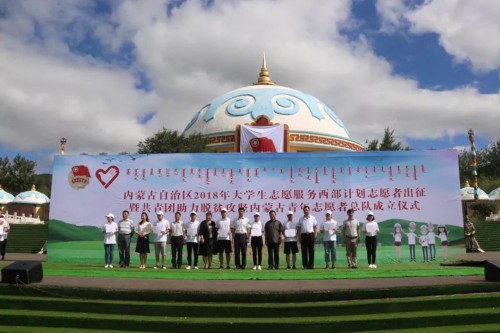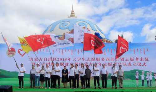 7月25日上午,内蒙古自治区2018年大学生志愿服务西部计划志愿者出征暨共青团助力脱贫攻坚内蒙古青年志愿者总队成立仪式在内蒙古青少年生态园举行,内蒙古自治区团委副书记刘晓宇出席活动并讲话。内蒙古自治区教育厅、自治区人力资源和社会保障厅、自治区文明办、自治区扶贫办等成员单位和相关工作部门负责同志出席活动。2018年西部计划志愿者、青年社会组织代表和青年志愿者代表近500人参加了出征仪式。