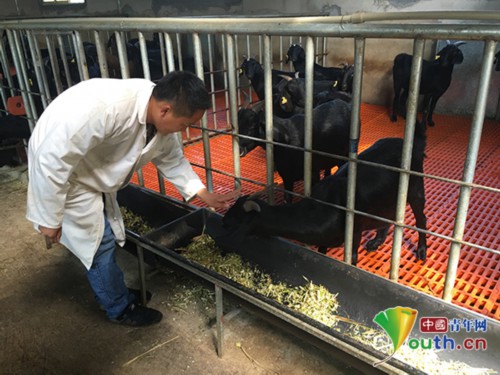 安文忠在集中养羊场查看努比亚山羊进食状况。本人供图
