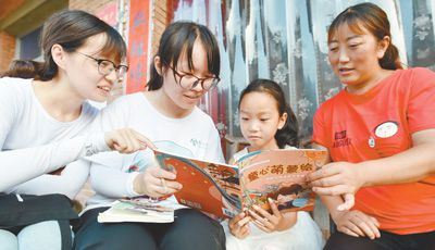 扬州大学教育科学学院日前组织在校乡村定向师范生开展暑期社会实践青年志愿服务公益教学活动,来到河南省三门峡市卢氏县偏远山区的农村小学及教学点,开设“萌蒙德馨”德育小课堂,弥补贫困山区乡村小学品德教育缺失的短板。图为“准乡村教师”在卢氏县瓦窑沟乡庙上小学的孩子家中结合自主创编的德育绘本进行辅导。