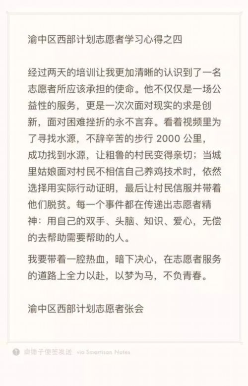 到祖国最需要的地方锻炼成长,为边远山区基础教育事业发展略尽绵薄之力,志存高远,脚踏实地,用爱浇灌祖国未来之花!