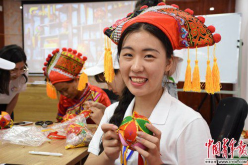 土家族女孩彭娴此前并不清楚绣球是壮族特有的民族工艺品。亲手缝制绣球后,她打心眼里羡慕绣球文化得到了现代传承。她联想起家乡的土家族古老手工艺品西兰卡普。“老一辈的会制作西兰卡普,到我们这一代好像就有一点断层。”彭娴有些遗憾地说。活动结束后,她将深入了解并学习西兰卡普的制作,身体力行做本民族文化的传播者、弘扬者。