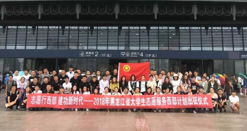 7月19日、22日,黑龙江省2018年服务新疆、服务西藏西部计划志愿者在哈尔滨站、哈尔滨西站分别举行出征仪式,来自黑龙江省50余所高校的200余名西部计划志愿者整装待发,奔赴新疆、新疆生产建设兵团、西藏等地。