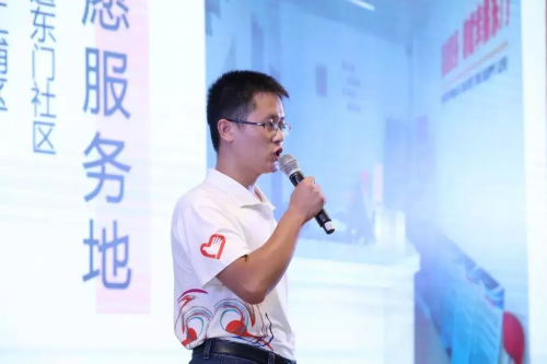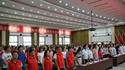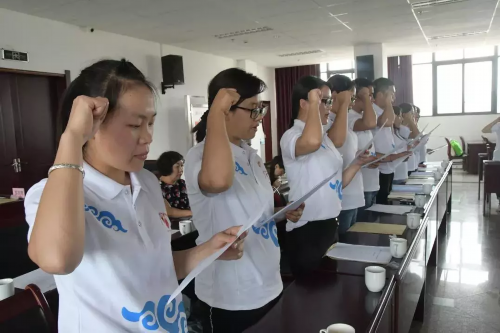 志愿者代表带领全体志愿者宣誓:立足岗位、尽己所能、帮助他人、服务社会、传承志愿精神,践行核心价值观,以青春之我,奋斗之我,为全面建成小康社会,实现伟大中国梦贡献青春力量!