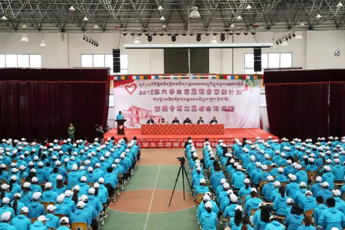 7月29日,2018年大学生志愿服务西部计划西藏专项志愿者出征活动在拉萨北京实验中学举行,来自全国18个省(区、市)的1000余名新招募西部计划服务西藏专项志愿者以及7地市西部计划项目办负责同志参加出征活动。