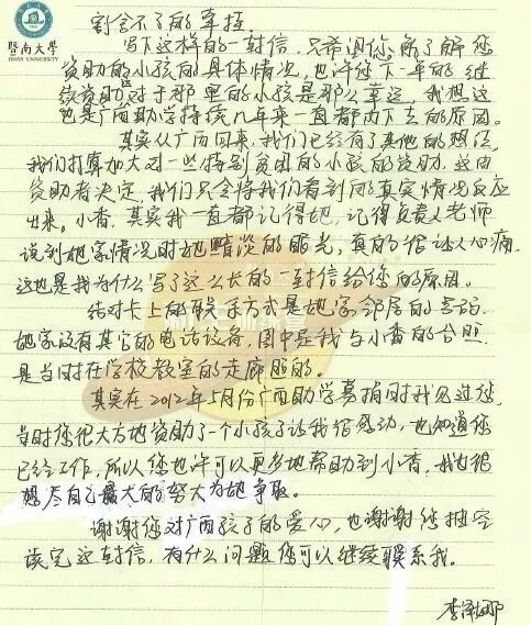 “当时志愿者们说可以指定名单上的一位受助人,我只是简单的回复了一句:‘挑名单上最小的一位便可以了。’”当时受助孩子名单上最小的一位就是小香。就这么,相隔近千公里的两个人隐隐地有了联系。