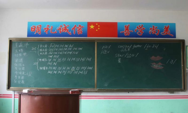 “我知道!我知道!这个是“梅花/æ/ ”有一位小朋友面对志愿者写出的音标得意洋洋地大声读出了,可遇到“/θ/”这个“拦路虎”时,同学们却犯了难,始终读不出正确的读音。志愿者在黑板上画出了一个嘴巴,把舌头画在上下牙之间,同学们模仿志愿者的口型,学得有模有样,大胆跟读的声音愈发响亮。