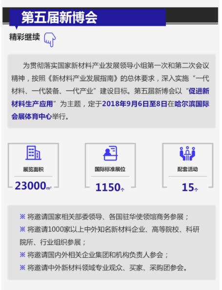 第五届新博会以“促进新材料生产应用”为主题,由工业和信息化部与黑龙江省人民政府共同主办,将于2018年9月6至8日在哈尔滨国际会展体育中心召开。