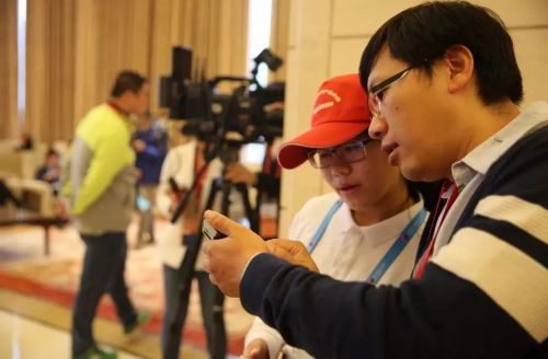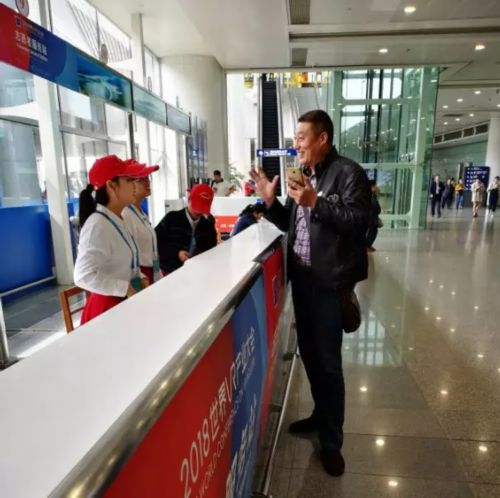 ▲志愿者在帮助嘉宾指路