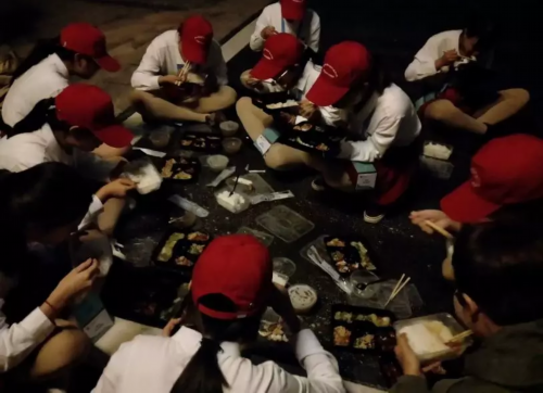 ▲一对一服务组志愿者在忙里偷闲就餐