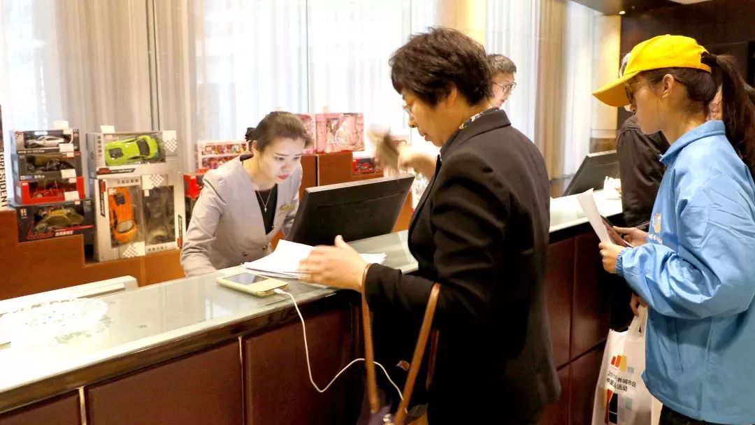 ▲ 志愿者正热情地为外国宾朋介绍活动情况