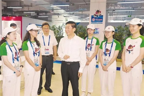 七月二十九日,山西省委书记骆惠宁在青运会志愿者中心,与大学生志愿者亲切交流。记者 李联军摄