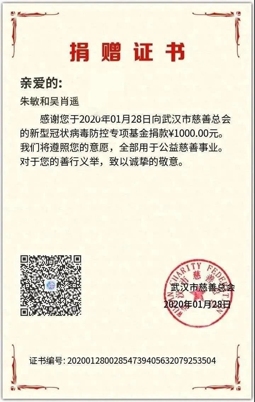 心存阳光的人,在哪都在传递温暖。自新冠肺炎疫情发生以来,他们时刻关注着各大新闻媒体中有关疫情的新闻报道,保持着跟孩子们的联系,关心他们生活状况,指导他们做好疫情防护,并第一时间向武汉市慈善总会捐款1000元,“我是党员,我也想为祖国做点努力,捐款是我们想到的第一件事,所以就做了。”