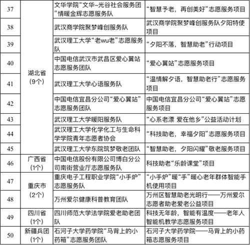以上50个示范项目团队要在各地积极发挥示范带动作用,带领更多的志愿者参与“金晖行动——智慧助老”志愿服务,一起帮助老年人跨越“数字鸿沟”、走出“数字困境”,让老年人在信息化发展中有更多获得感、幸福感、安全感!