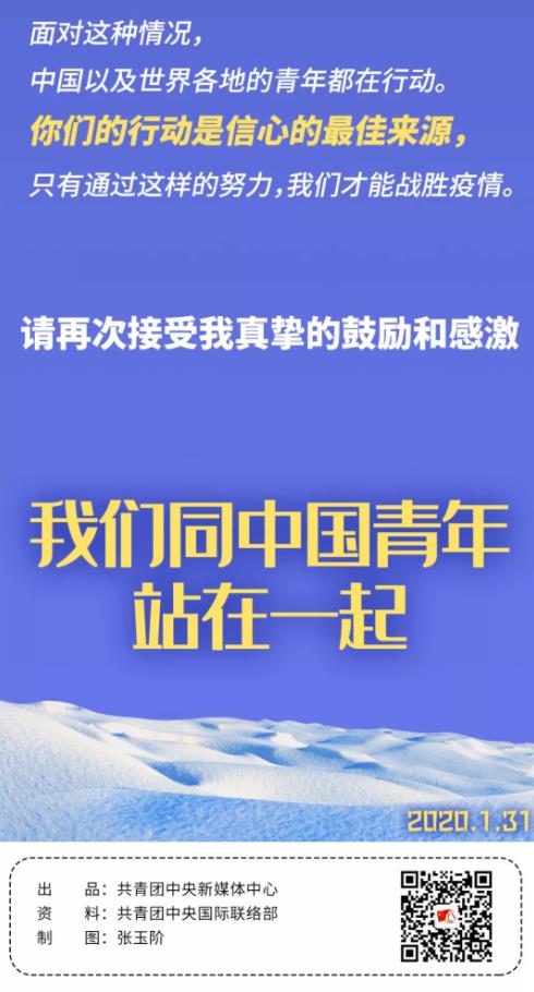 来自世界各地的青年朋友也密切关注我国新型冠状病毒疫情发展情况,纷纷发来诚挚的问候: