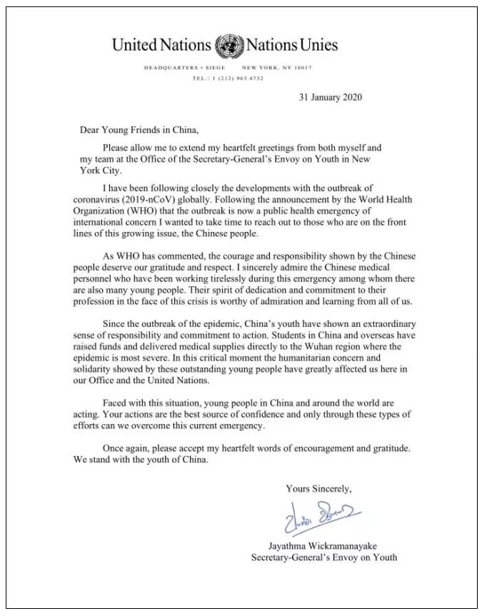 联合国秘书长青年特使贾亚特玛·维克拉玛纳亚克1月31日专门致信共青团中央、全国青联,对中国青年在抗击肺炎疫情中表现出来的责任感和行动力给予高度赞赏,号召世界青年与中国青年一起行动起来,共同战胜疫情。