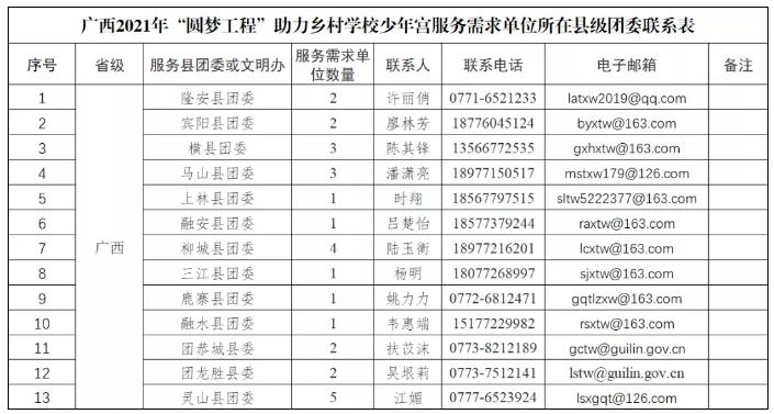 广西2021“圆梦工程”助力乡村学校少年宫联系表