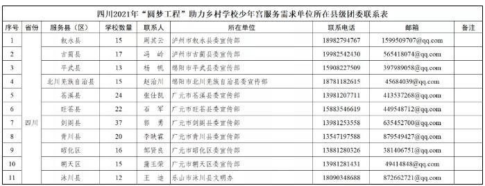 四川2021“圆梦工程”助力乡村学校少年宫联系表