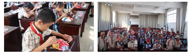 志愿者们巧妙地选择幽默有趣的剧目《红娘》作为欣赏片段,唱词简单,情节贴近生活,让孩子们能更快地体会到京剧的魅力,以美育课程浸润童心。志愿者们还结合歌曲《说唱脸谱》,为孩子们讲述不同颜色脸谱所代表的人物形象特征,对京剧脸谱的造型和色彩,表现的人物性格和道德伦理特征有了更深地认识。同时,学生们根据自己的喜好,亲手绘画创作了专属脸谱。本次课程为孩子们学习中国戏曲、传承中国传统文化提供了一个良好的机会,以戏润心,以美育人,让美育之美在苏圩镇孩子们的心中灿烂绽放。