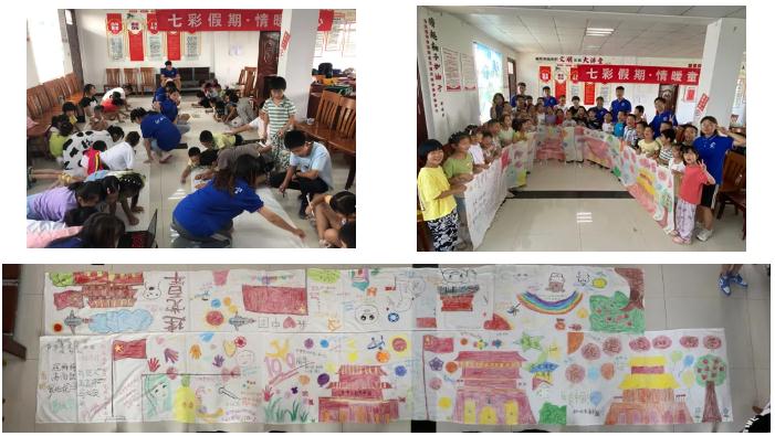 聊城大学青年志愿者协会前往安徽省芜湖市襄安镇,在志愿者的帮助下,孩子们五人为一组,在长卷上尽情地涂抹挥洒,用五彩的画笔表达自己对党和祖国母亲的热爱,将心中的祝福浓缩在小小画笔之中。一幅幅灵动的画面跃然纸上,画出了孩子们心中最美的祖国,最伟大的党。画出了代表祝福、吉祥、民族团结一家亲,同心共筑中国梦的图画,青年志愿者与小朋友们一起,为中国梦加油,为中国梦奋斗!