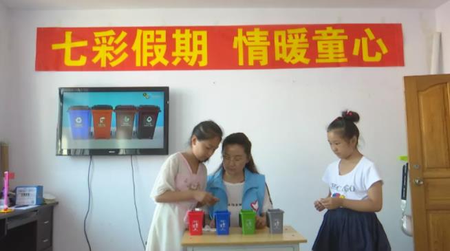 吉林省青年志愿者利用“七彩假期”活动包教孩子们学习垃圾分类知识。